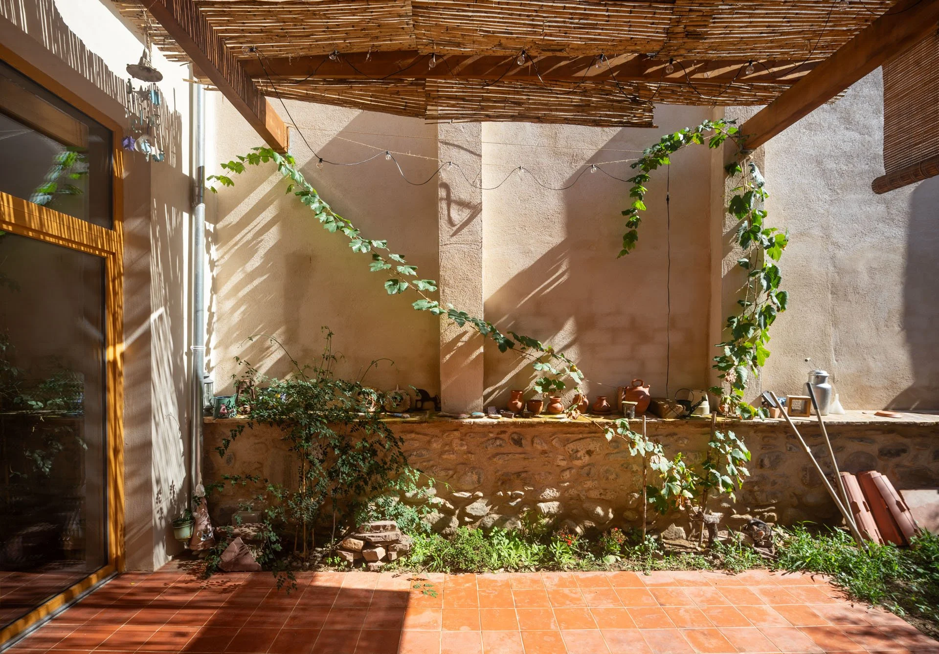 Un patio al sur donde las plantas son las protagonistas: vegetación autóctona que requiere poco riego y mantenimiento, plantas aromáticas que utilizamos en la cocina, una incipiente parra que nos dará sombra en verano y dejará pasar el sol en invierno, un pequeño huerto…